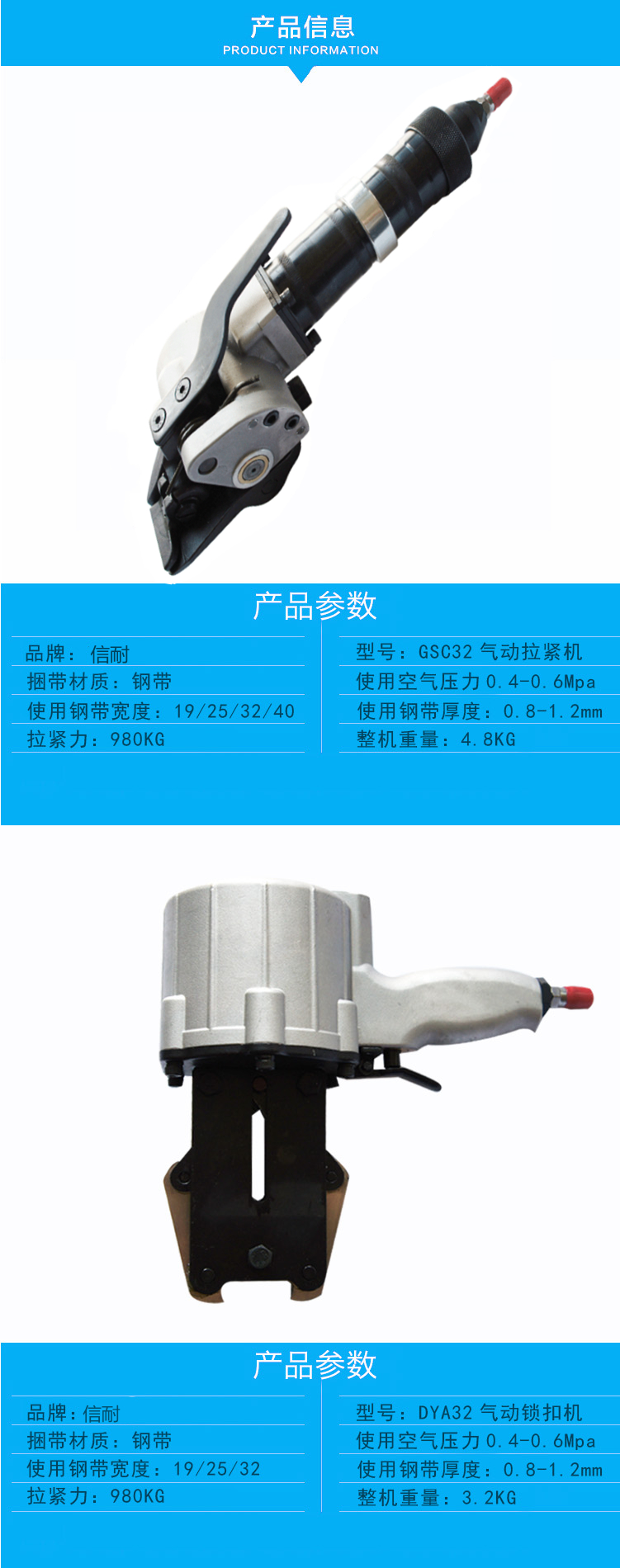 KZL-32氣動鋼帶拉緊機19、25、32mm鋼帶可以通用,KZS-32鎖扣機可以打19、25、32mm鋼帶任選其一。